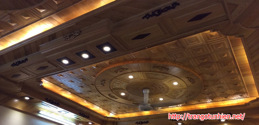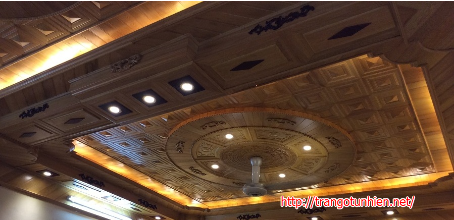 Mẫu trần gỗ tự nhiên nổi trội với nối thiết kế hoa văn trống đồng cổ thể hiện bản sắc dân tộc cộng với hoa văn đồng tiền dạng dây thể hiện sự giầu có và sung túc của gia chủ sự kết hợp của hai yếu tố này làm toát nên sự sang trọng uy nghi cho phòng khách. Với sự kết hợp với hoa văn kheo léo cho không gian trần gỗ không có cảm giác khô cứng hay gò bó mà rất uyển chuyển nhẹ nhàng